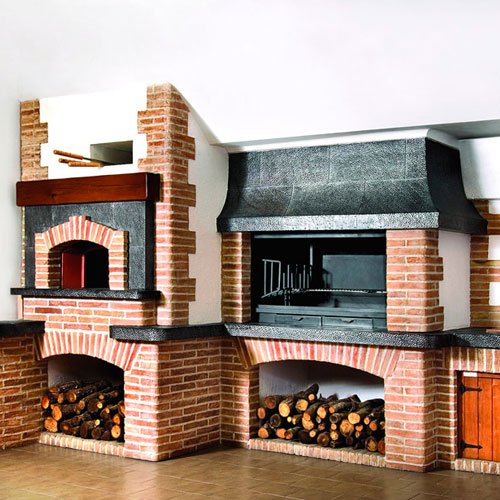 Комбинированная барбекю из кирпича, плиты из нессиметричного сланца Pizarra. Центральная часть духовки, быки, металлические плиты и короб рустикальной обработки. Дверцы и балка из дерева обработки Iroko. Духовка размером 110 см, металлическая топка размером 120х65 см, зольник и решетка для жарки с направляющими, вертикальный гриль сбоку.