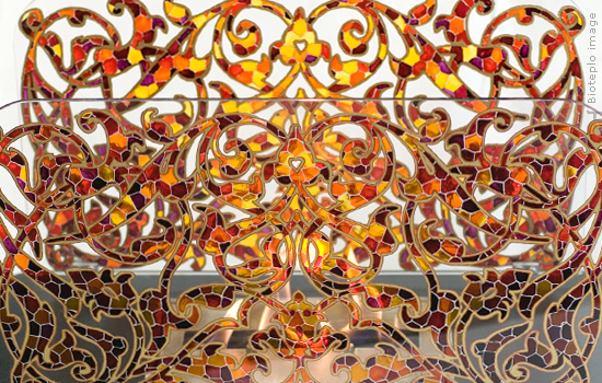 Модель «Самурай» может быть выполнена с витражными стеклами. В этом случае композиционный акцент модели смещается на цветной узор росписи, а пламя или свет, проходящий сквозь стекла биокамина подсвечивают созданный орнамент.