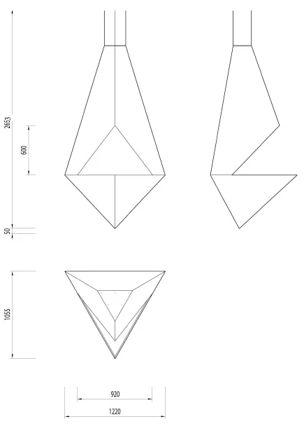 - В основе дизайна этого подвесного биокамина лежит простая геометрическая фигура – треугольник. Великолепие треугольных плоскостей придает камину энергию движения. Пламя, через призму треугольного взгляда, заставляет созерцать его с самой бескомпромиссной точки зрения.