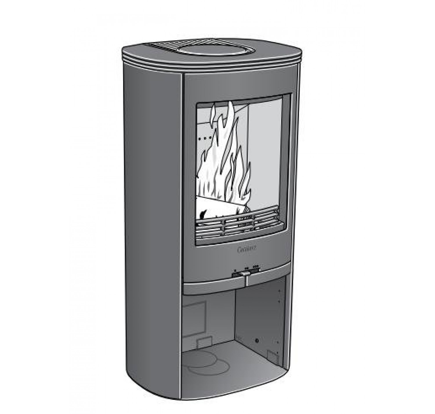 Оснащен поворотной колосниковой решеткой и выдвижным зольником. Отделка: боковые панели - металл; верхняя панель- чугун, сталь или талькомагнезит.