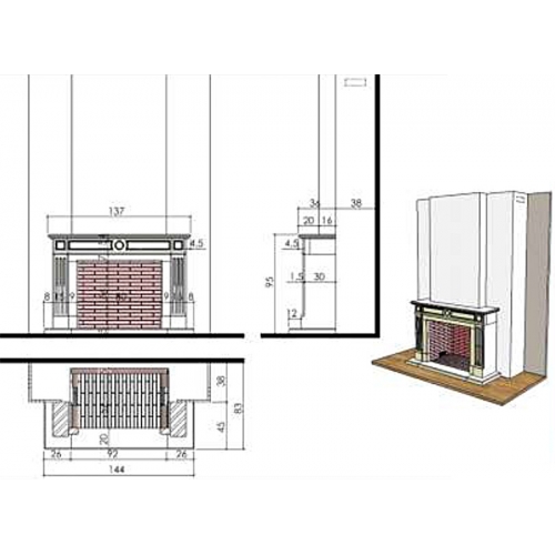 - Полувстроенный камин.Камень Doura.Красный кирпич 3 см - швы белые.Открытый огонь: 80 x 64 cm.