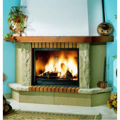 Угловой камин серии Stylo из песчаника Arenisca в сочетании грубой обработки и обработки бучардой. Центральная плита и консоль из огнеупорного кирпича толщиной 5 см. Металлическая топка 904, колосник и зольник.