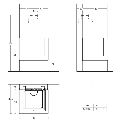 Камин с основанием из майолики, доступной в различных вариантах цвета из палитры Piazzetta. Облицовка камина довольно компактна и хорошо подходит для комнат с небольшой площадью. Основание камина сделано из мрамора, стальной вертикальный элемент отделан черной эмалью. Топка имеет три панели из огнеупорного стекла, что позволяет особенно подчеркнуть красивый вид пламени. Камин совместим с топками: MA 274 SL