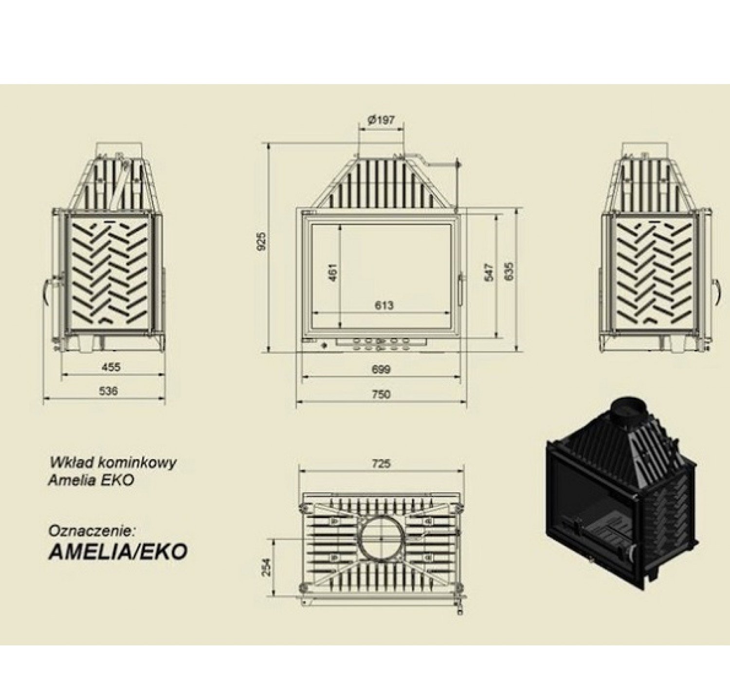 Amelia EKO/GLASS (двойное стекло)— топочная камера или топка-вкладыш, предназначена для отопления дома площадью до250 кв.м. Топки KRATKI серии Amelia EKO/GLASS имеют систему двойного дожига— это позволяет не только наиболее эффективно извлекать тепло, ноитакже защищает дымоходную систему камина отзасорения продуктами сгорания, и, что немаловажно, уменьшает количество выбросов СОватмосферу. Топка Amelia EKO/GLASS— топка, изготовленная из чугуна, сбоковым открытием дверцы идвойным стеклом. Особенности оборудования серии Amelia EKO/GLASS отKRATKI: Чугунная топка непрерывного сгорания; Топка высокой мощности, предназначена для больших помещений; Теплоемкость прибора увеличивают ребра повсему корпусу; Топливо— сухие дрова длиной до500 мм; Стекло— термостойкая стеклокерамика, предел нагрева 800 С; Полная герметичность дверцы, двойное остекление; Система «двойного дожига»; Пониженное содержание СОввыхлопных газах; Топка имеет съемную ручку надверце; Прозрачность стекла обеспечивает система встроенного обдува; Предусмотрен держатель дров— непозволяет рассыпаться при открытии дверцы; Дно топочной камеры имеет отверстие для золы.