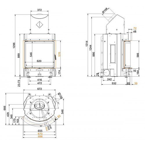 Стальная топка с панорамным стеклом. Боковое открывание двери. Ширина дверки 620 мм, высота - 546 мм. Возможно подключение воздуха из-вне. В комплекте поставляется декоративная рамка.