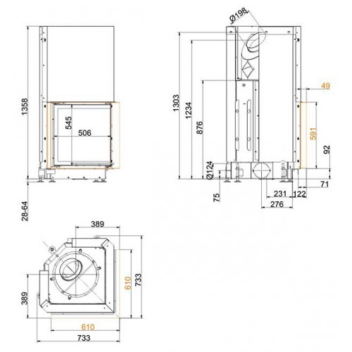 Угловая каминная топка с цельным Г-образным стеклом. Дверца с подъемным механизмом (система Easy-Lift). Топочная камера футерована шамотом. Ширина дверки 506/506 мм, высота - 545 мм. Возможно подключение воздуха из-вне.