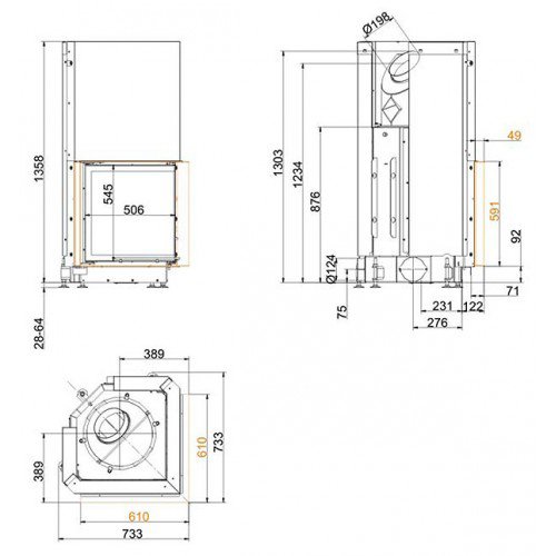 Угловая каминная топка с цельным Г-образным стеклом. Боковое открывание двери. Топочная камера футерована шамотом. Ширина дверки 506/506 мм, высота - 545 мм. Возможно подключение воздуха из-вне.