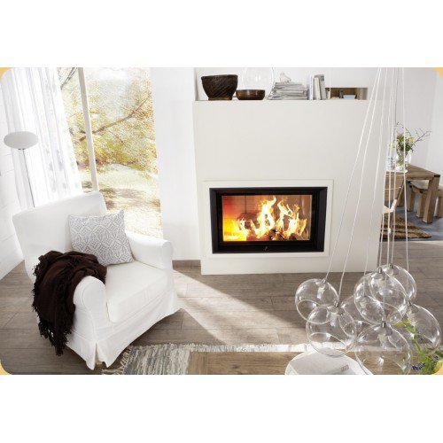 Каминная топка с прямым стеклом. Топочная камера футерована шамотом. Подъёмный механизм двери (система Easy-Lift). Ширина дверки 732 мм, высота - 592 мм. Возможно подключение воздуха из-вне. В комплекте поставляется декоративная или монтажная рамка.