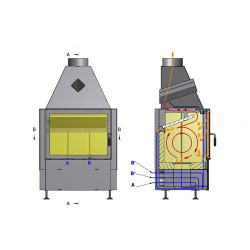- Трехуровневая подача воздуха в топку извне — система Jet Stream - воздух поступает в топку через зольник и на стекло дверцы, образуя воздушный занавес и в дымоход топки для обогащения кислородом зоны, в которой проходит процесс догорания отходящих топочных газов.