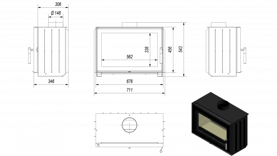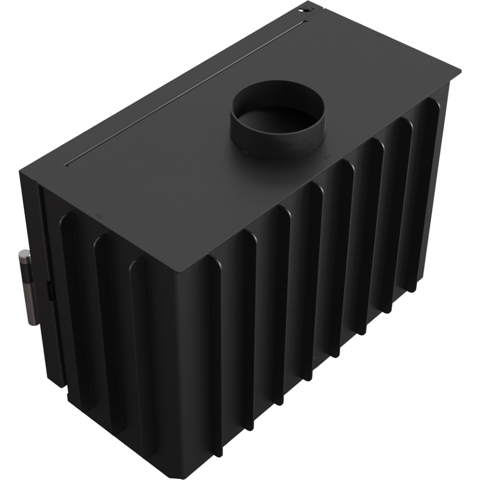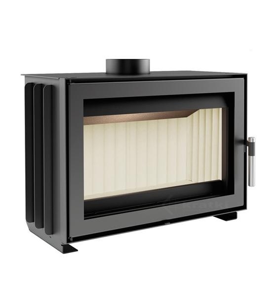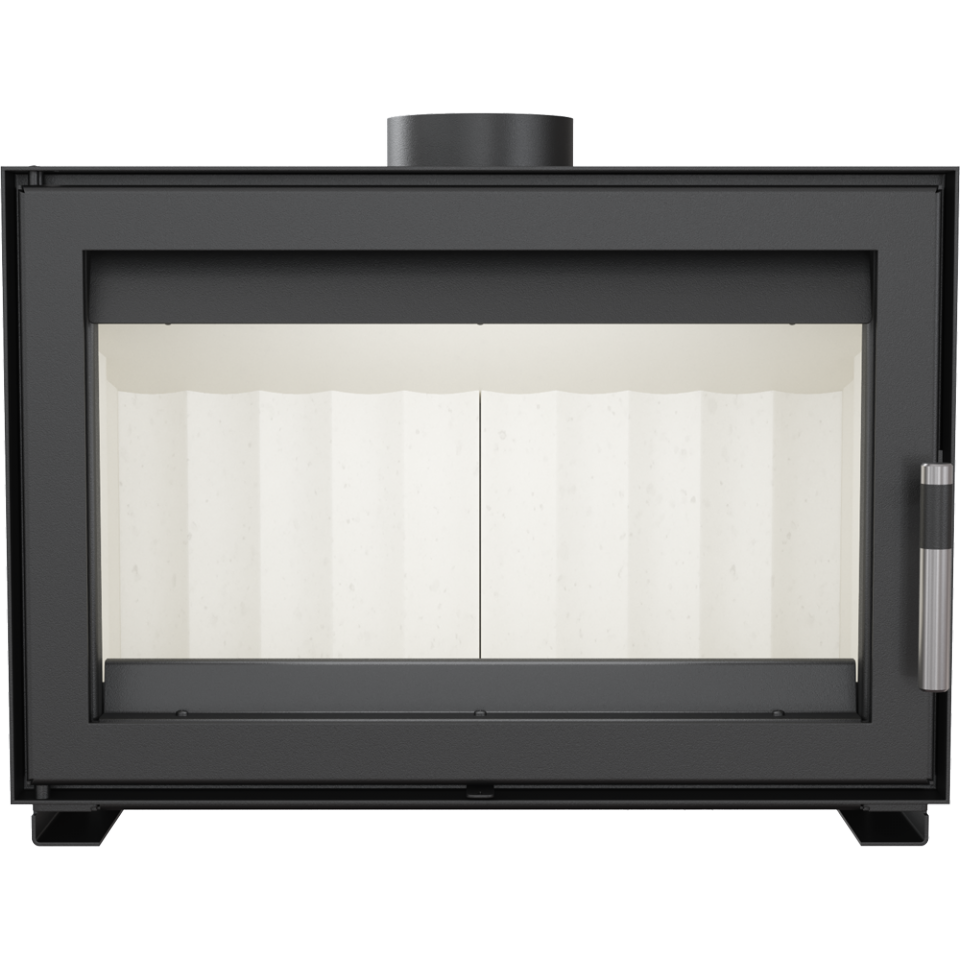 Корпус камеры изготовлен из специальной термостойкой стали, для улучшения тепловых характеристик камера изнутри выложена вермикулитом. Большое термостойкое стекло с системой самоочищения позволяет насладиться видом горящих дров. Дополняет современный вид камина стильная ручка.