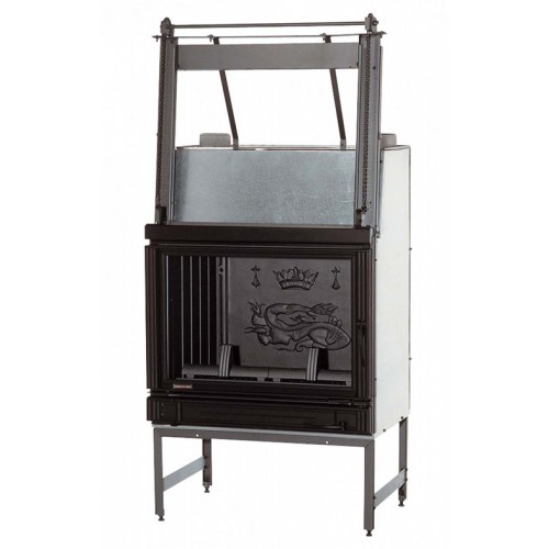 Каминная печь с чугунным очагом. Прямое обзорное стекло, устойчивое к высокой температуре. Дверь с подъемным механизмом. Регулируемые ножки.