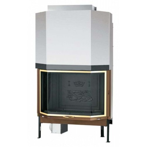 Каминная печь призматической формы, выполненная из толстостенной стали. Внутренние стенки и низ очага из чугуна. Дверь с декоративной каймой из золотистого металла. Дверь открывается вверх. Чугунная колосниковая решетка. Увеличенный дымосборник.
