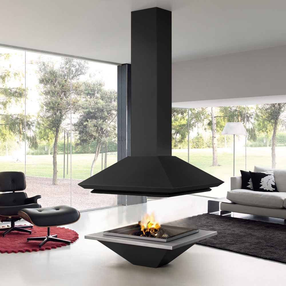 Центральный камин квадратной формы с двойным корпусом. Без стекла. Цвет - черный.