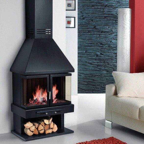 Фронтальный металлический камин с двумя дверцами. Топка из толстой стали. Зольник с решеткой встроены в нижнюю часть камина. Ниша для дров. Снабжен телескопическим элементом, позволяющим варьировать высоту от 2,60 до 3,10 м (от потолка до пола) и крепежом к потолку, дымоход диаметром 17,5 см.