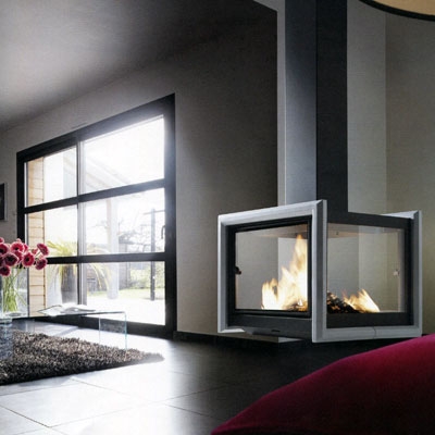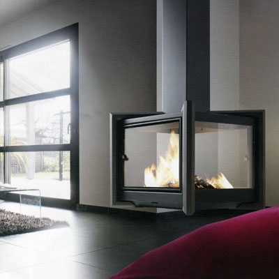 Фиксированный или вращающийся центральный камин Don-Bar (Бельгия) на дровах с асимметричной рамкой. Исполнение рамок возможно в черном, титановом и серебряном цвете без наценки.