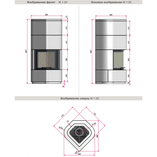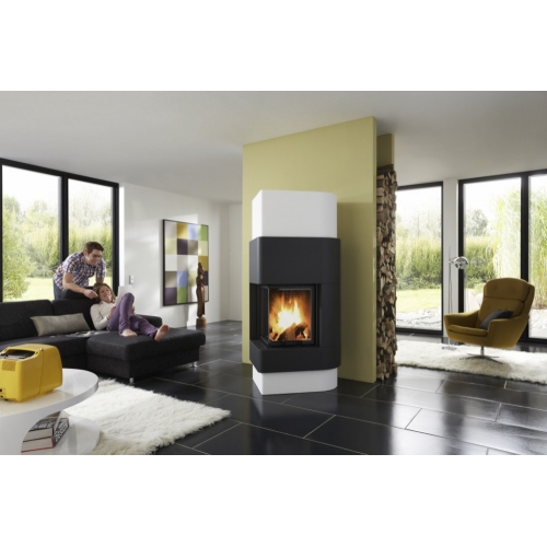 Топка: Schmid Ekko 4557h с открытием двери вверх. ( Номинальная мощность – 7 кВт., патрубок под диаметр дымохода: 180 мм. )