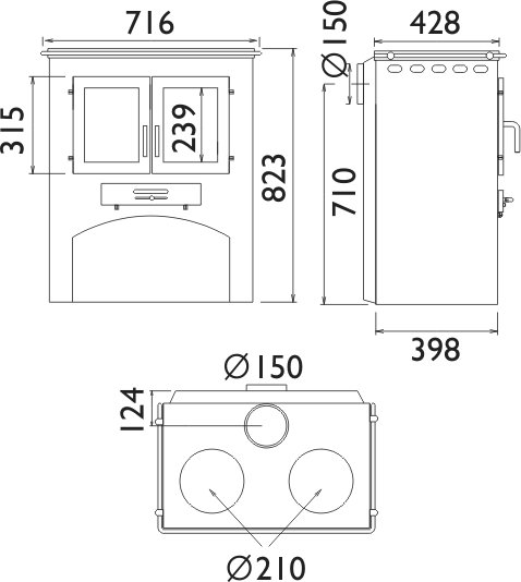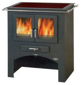 Представленная модель стальной кухонной печи с варочной поверхностью из стеклокерамики поможет не только хорошо отапливать дом, но и готовить горячие блюда, поэтому особенно рекомендована для дач и загородных домов (технические характеристики и высокая мощность (7/9 кВт)позволяют рекомендовать ее для обогрева жилого пространства в 180 куб. метров). Топочная часть закрыта двустворчатым стеклокерамическим окном (выдерживающим нагрев в 700 градусов) немного приподнята, освобождая тем самым место для открытой дровницы с арочным входом. Как и обычная стеклокерамическая плита, эта кухонная дровяная печь с варочной поверхностью из стеклокерамики, очень практична и легко чистится. Мы можем предложить также подобную плиту, позволяющую нагреть воду для домашних нужд.