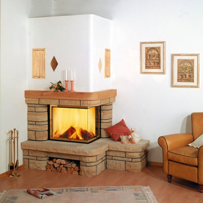 Угловой камин из натурального камня Sandstein bossiert, с деревянной балкой.