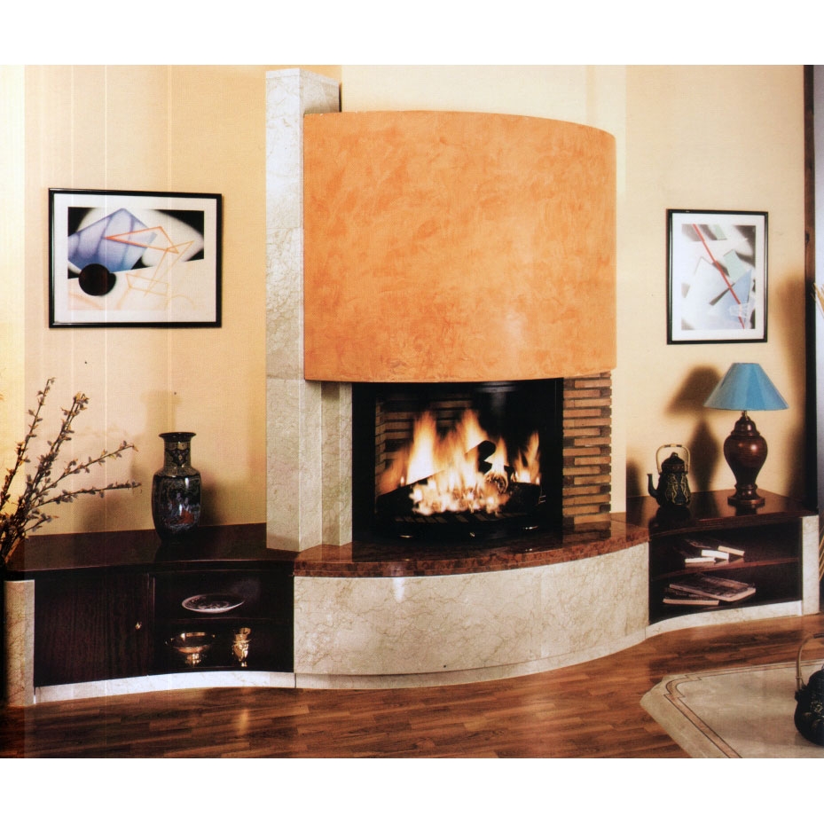 Фронтальный камин полукруглой формы из полированного Crema Marfil. Плита из полированного мрамора Rosso Forte и боковой пилар из огнеупорного кирпича толщиной 3 см.
