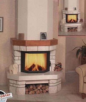 Пристенный камин из натурального камня Sandstein bossiert, Untersims Sansdstein geschliffen. Столешница из полированного натурального камня. Деревянная каминная полка.