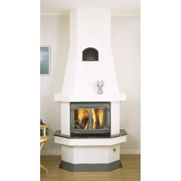 С призматическим стеклом в дверцах, Mistral создает уют открытого очага. В то же время это очень эффективный источник тепла. У Mistral большая чугунная топка, вмещающая много дров. Темный цвет чугунных элементов красиво контрастирует с белой поверхностью облицовки. Хотя Вы можете сами выбрать отделку поверхности, боле тонкую или грубую штукатурку, а затем покрасить в любой цвет по своему выбору.