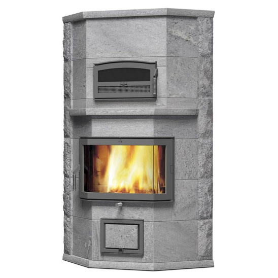 Угловой печь-камин с задним нижним подключением 2 теплового класса, для больших помещений. С духовкой.