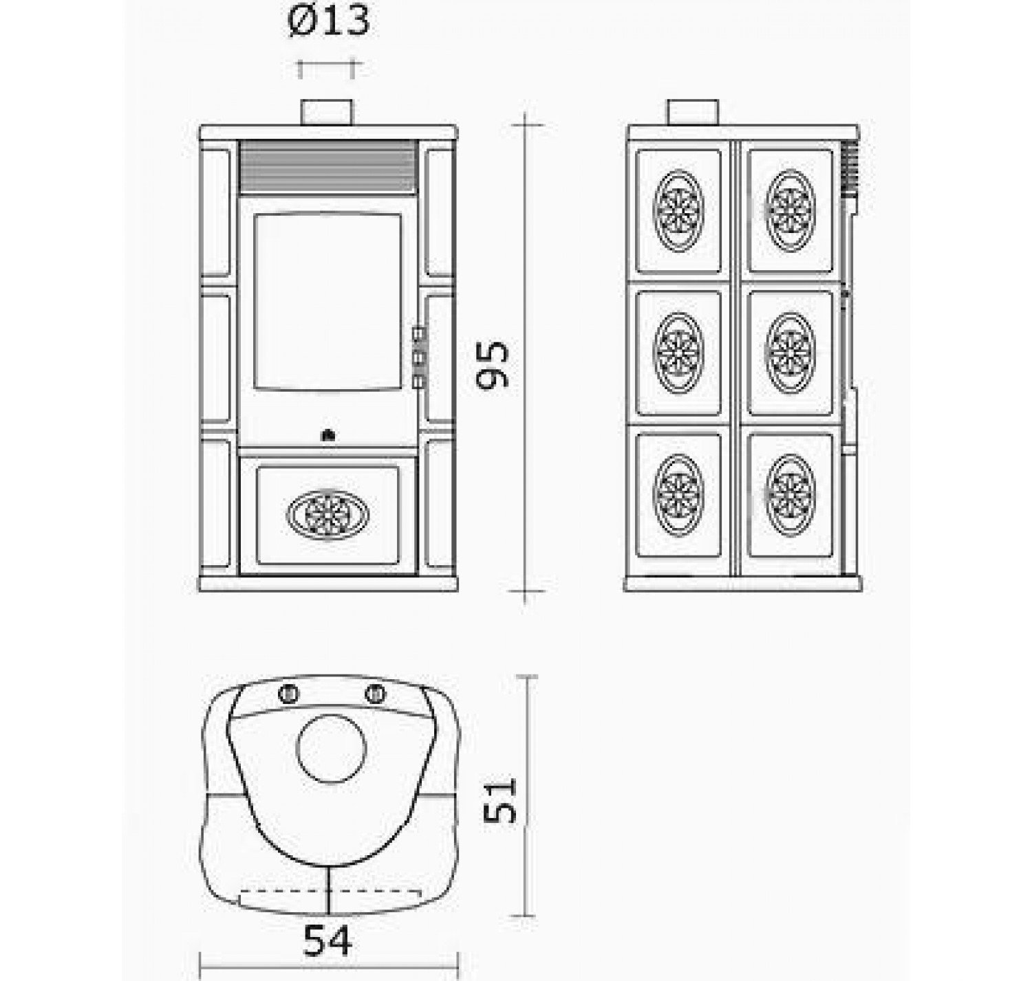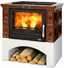 Отопительная печь с облицовкой из цветной керамики с цветочным барельефом. Печь работает на дровах. Принудительная вентиляция. Стальная структура с чугунным очагом.