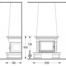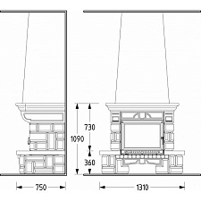 - Подходящие топки: с прямым стеклом с подъемом или боковым открыванием дверцы, открытая топка, электроочаг. В комплект входят плиты для адаптации под топку