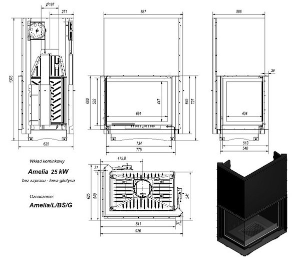Топка AMELIA/L/BS, Г-образное стекло слева, гильотина