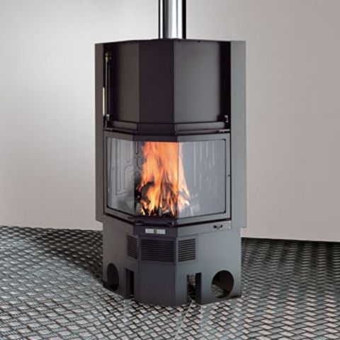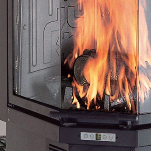 Топка с закрытым очагом. Оснащена дверцей с призматическим стеклом и рамкой черного цвета. Имеет два воздуховода горячего воздуха.