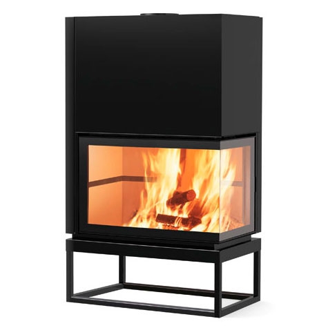 Угловая дровяная топка с очагом из огнеупорного материала и обширным обзором огня.