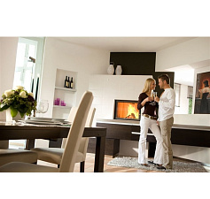 Призматическая топка. Закрытая топка со стальным корпусом и широким обзором огня. Эркерное составное огнеупорное стекло. Очаг с чугунной футеровкой. Плавный подъем дверцы-гильотины. Топка может устанавливаться как с пристенной облицовкой, так и в угловой версии камина.