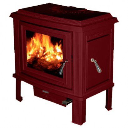 Печь с фронтальной и боковой дверцами, имеет систему Чистое стекло, ручка дверцы не нагревается в процессе топки. Печь покрыта эмалью, цвет - бордовый.