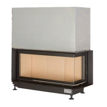 Угловая каминная топка с Г-образным стеклом. Боковое стекло справа. Топочная камера футерована шамотом. Подъёмный механизм двери (система Easy-Lift). Ширина дверки 802+302 мм. Высота дверки 353 мм. Возможно подключение воздуха извне.