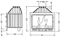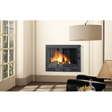 Угловая каминная топка с Г-образным стеклом. Боковое стекло слева. Топочная камера футерована шамотом. Подъёмный механизм двери (система Easy-Lift). Возможно подключение воздуха извне.