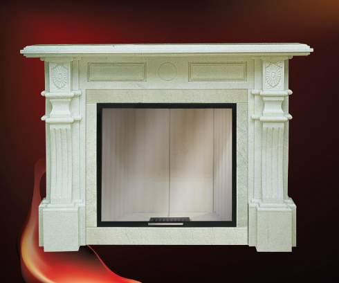 Камин с декоративными колоннами ручной работы. Классическая облицовка под закрытую топку с прямым стеклом.