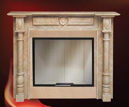 Фронтальный камин под дровяную топку с прямым стеклом. Облицовка выолнена в классическом стиле, декорирована круглыми колоннами и рельефными линиями.