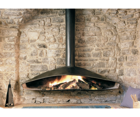 Подвесной или фиксированный у стены камин с широким отверстием (1,95 м), способный вместить исключительно длинные дрова.