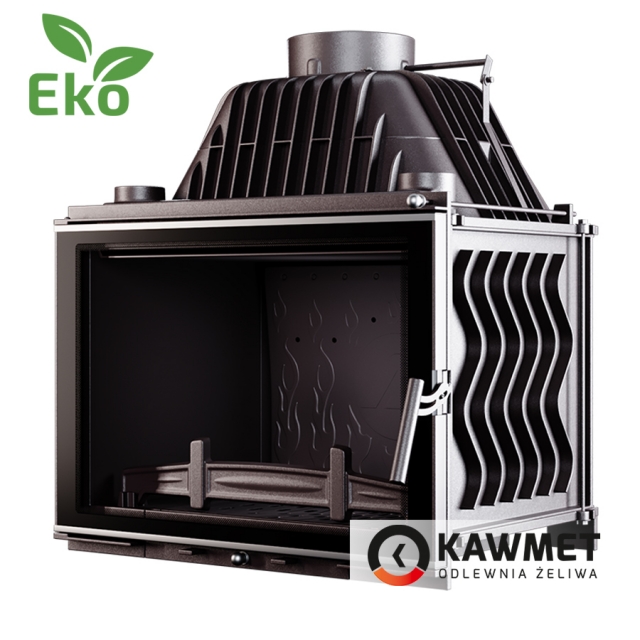 Повышенный КПД и теплоотдачу обеспечивает чугунный дефлектор, который расположен над камерой сгорания каминной топки KAWMET. Назначение дефлектора - направить недогоревшие частицы дровяного газа в центральную часть камеры сгорания, где происходит повторное догорание. Также дефлектор увеличивает тепловую эффективность топки путем удлинения пути прохождения продуктов сгорания.