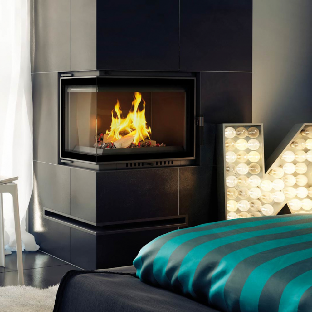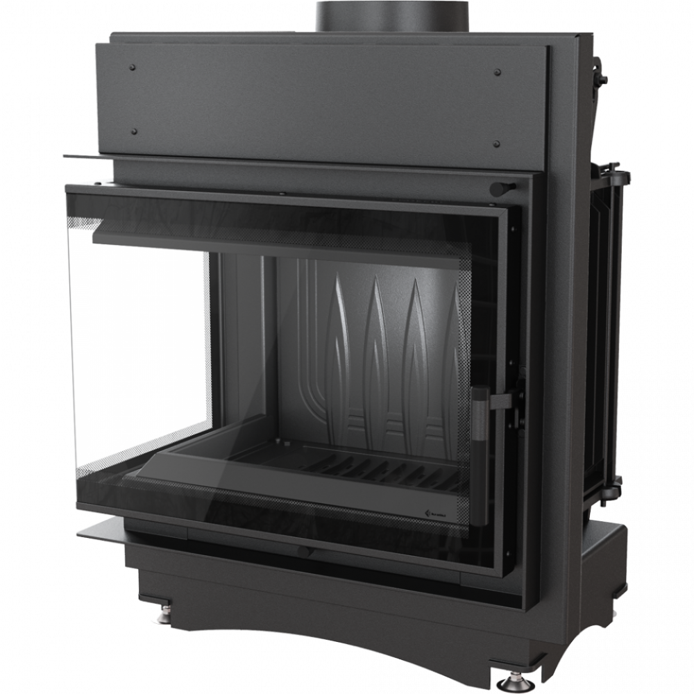 • Каминная топка с двумя стеклянными панелями, сопоставленными друг напротив друга под прямым углом (стеклянные панели соединены без рамы).