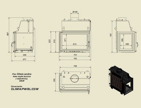 Мощная каминная вставка со встоенным теплообменником объемом 46,5 литров. Топку Oliwia/PW/BL/22 можно использовать в качестве котла отопительной системы. У топки имеется глухое боковое стекло слева. Внутренние части топочной камеры чугунные, а корпус выполнен из толстой стали.