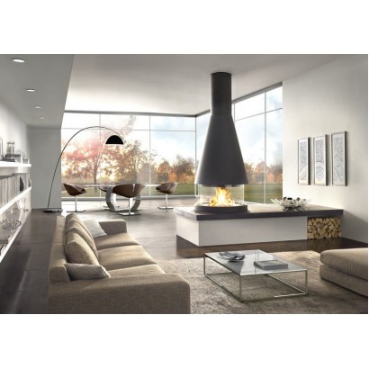 Основание изготовлено из больших панелей из майолики. Опора основания в цвете на выбор. Майолика ручной работы может быть изготовлена в цвете на ваш вкус из палитры Piazzetta. Обрамление и кожух из стали с отделкой из черной или белой эмали. Камин оснащен эксклюзивным электронным механизмом подъема и опускания переднего круглого стекла. На фотографии изображена модель из майолики Ardesia, дровяная топка M360 T.