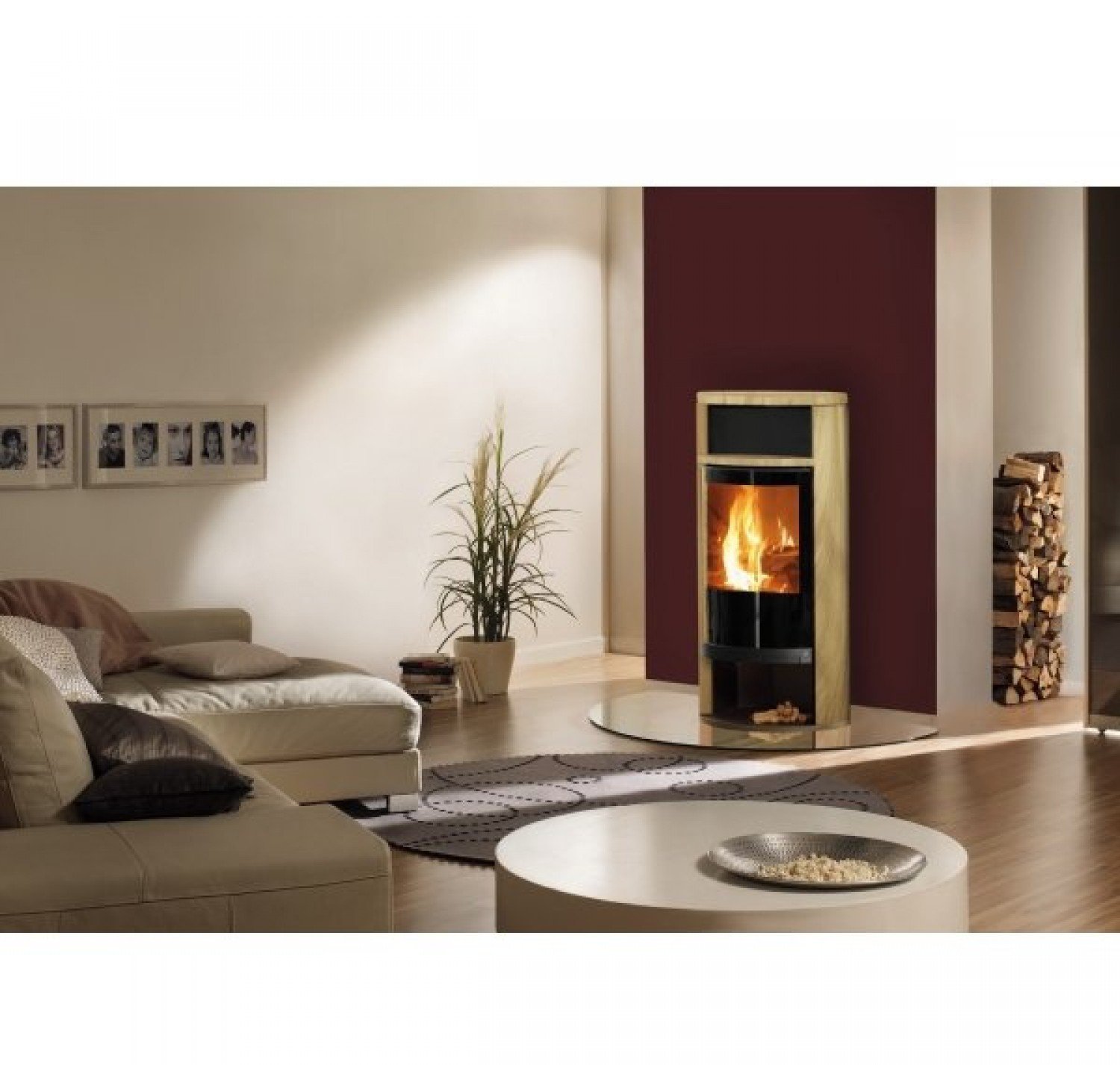 Экологически безопасная облицовка из природного декоративного талькохлорита или песчаника презентована тремя цветами: классический серый, светлый карамельный, изумрудный. Широкое панорамное стекло и возможность вращения камина на 180° позволят установить его в любой части комнаты и разворачивать в нужную сторону.