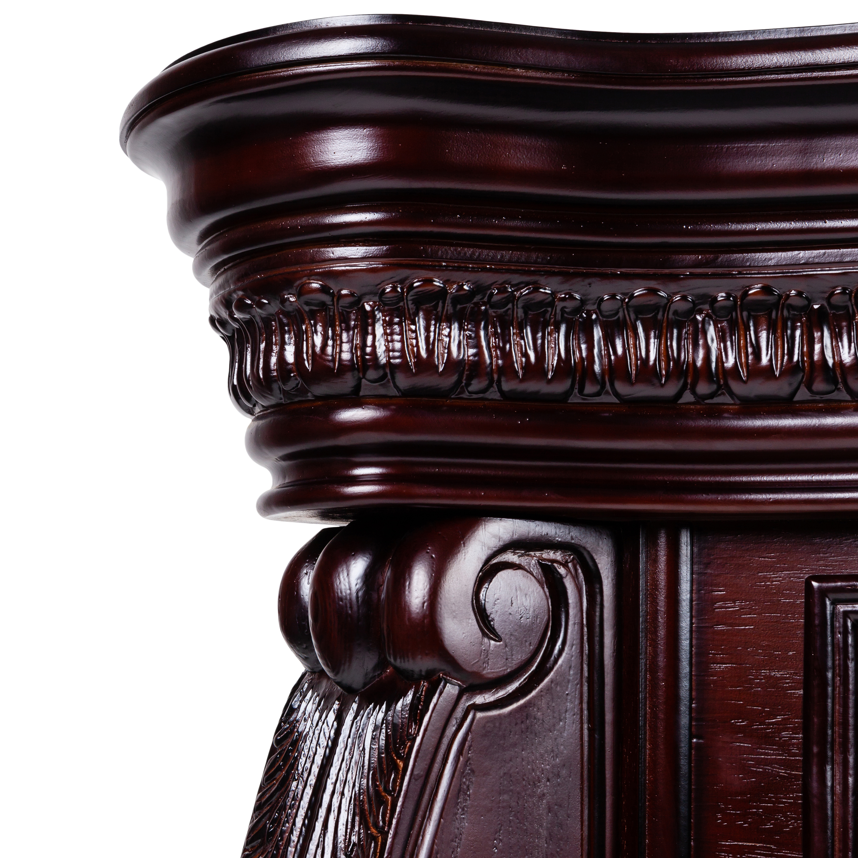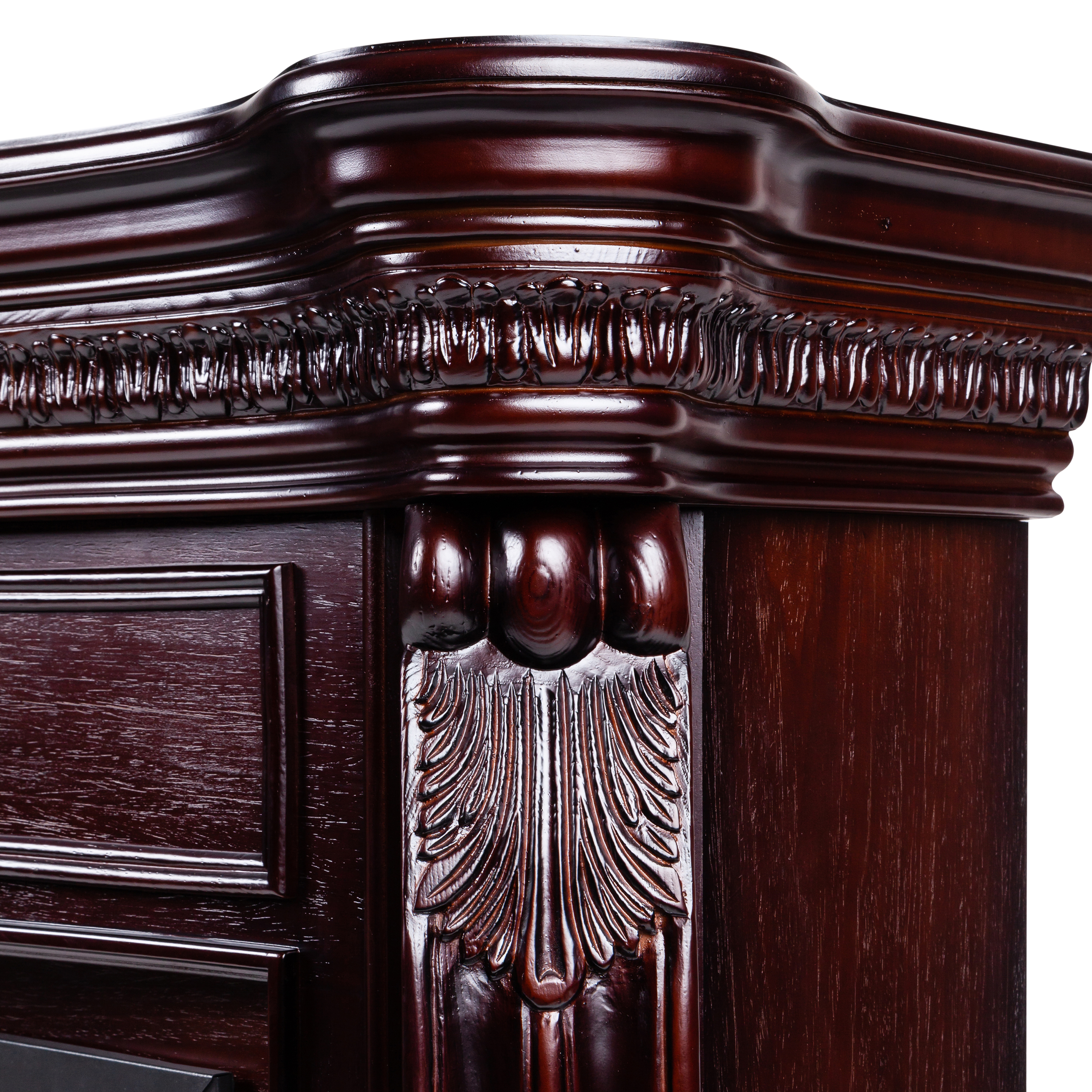 - Выполнен из качественного МДФ, тонированного в цвет античного дуба. Изысканная форма портала, верхняя панель украшена аппликацией из натурального шпона, карниз портала декорирован профилем и прекрасно выполненными резными листьями.
