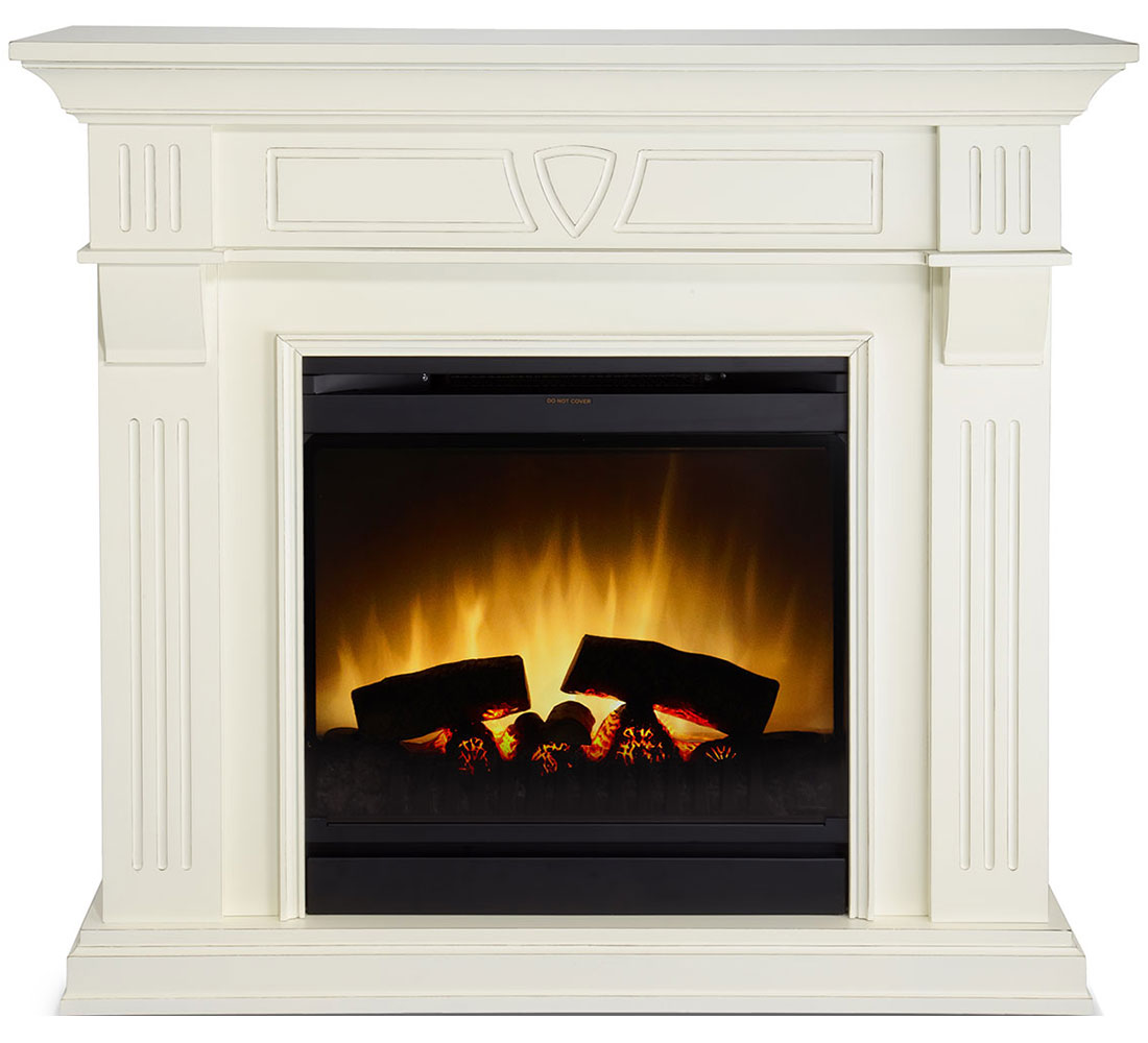 Стильное современное обрамление выполнено в четких прямых линиях, колонны и фронтальная часть портала украшены стильной резьбой. Каминокомплект представлен в единственном цвете «слоновая кость с патиной». Черный широкий очаг с эффектом пламени Optiflame станет ярким акцентом каминокомплекта, а яркое пламя притянет взгляд из любой точки помещения.