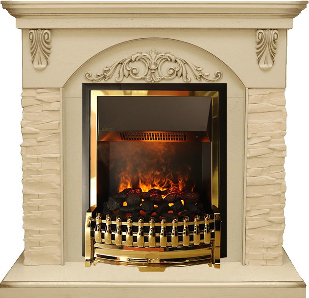 Вместо классических поленьев в очаге используется имитация  тлеющих углей.