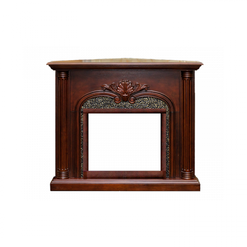 - Изящная резная отделка и панель под металл вокруг очага. Колонны делают обрамление более привлекательным. По центру портала красивый растительный узор.