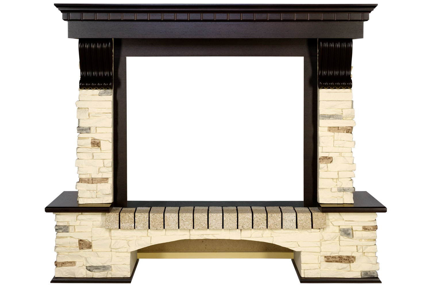 Модель представлена в нескольких вариантах, различающихся как по принципу установки (угловой или пристенный), так и цветовым решением облицовочного камня и деревянных элементов. Декорирована резными вставками в античном стиле.