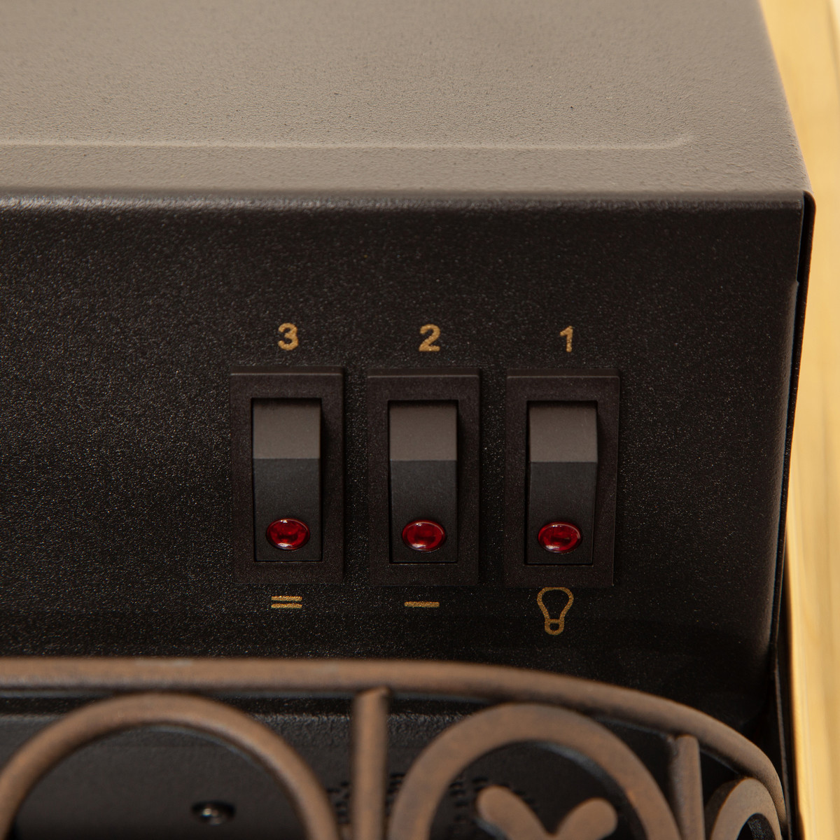 Электрический очаг Majestic Lux предназначен для встраивания в стандартные обрамления. В качестве муляжа - сгоревшие дрова. Нагреватель с поддувом спрятан в козырьке очага и обеспечивает обогрев в холодную погоду. Переключатель позволяет включать на полную (1 500 Вт) или половинную (750 Вт) мощность. В режиме визуализации пламени потребление электроэнергии составляет 80 Вт (две свечеобразные лампы E14 мощностью 40W)