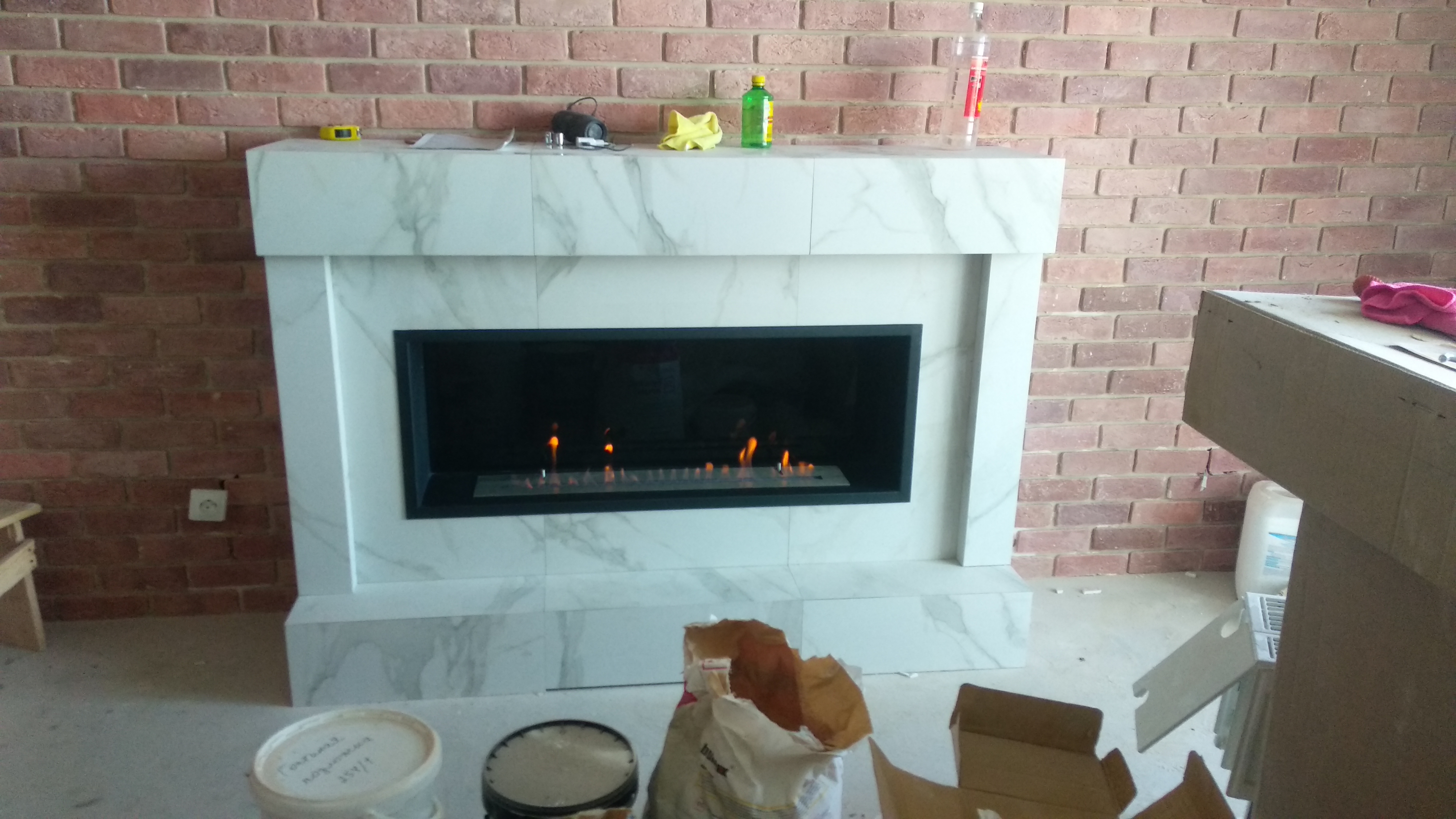 Квартира находится в новом доме . Ремонт в самом разгаре , но камин уже установили.